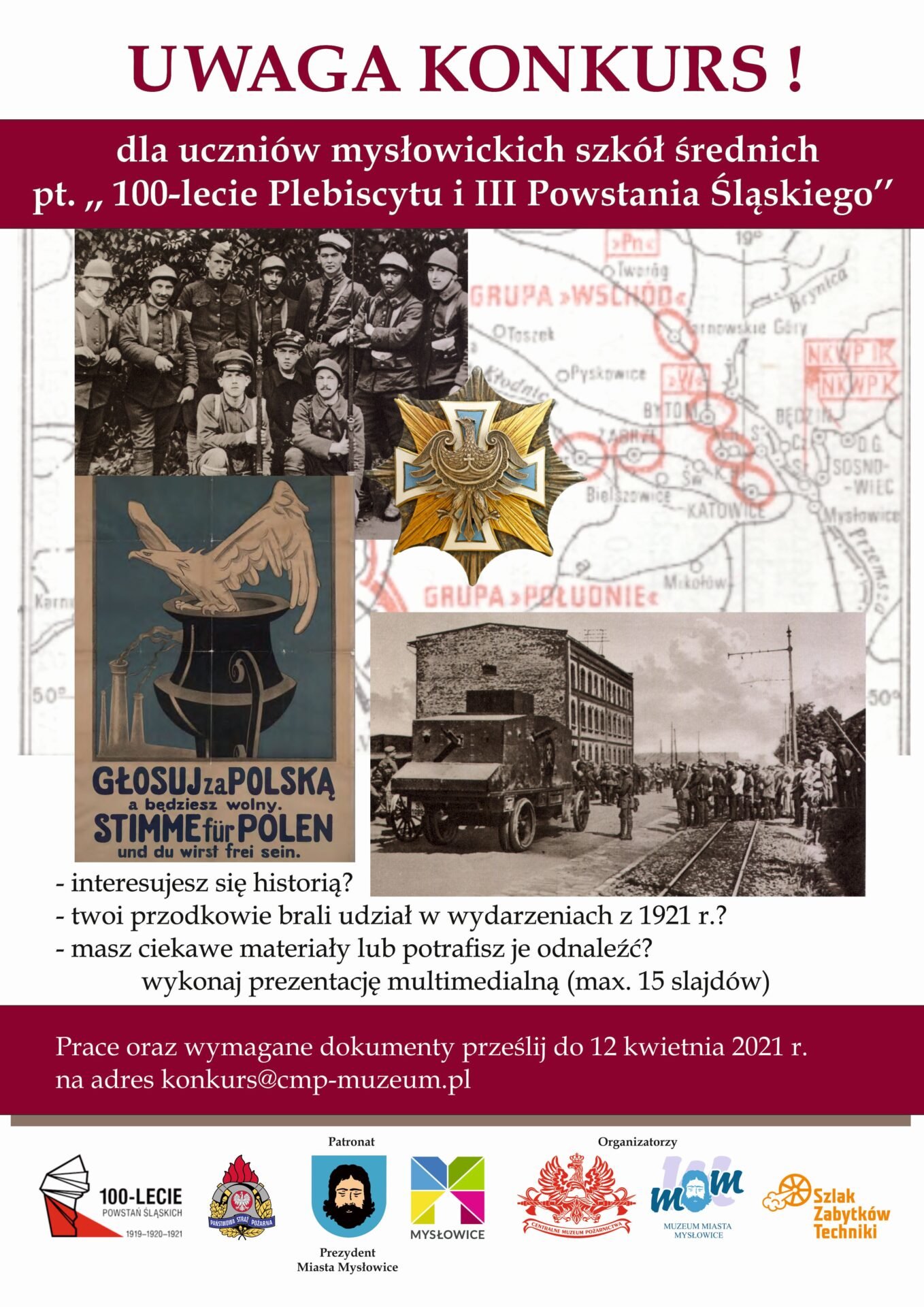 W bieżącym roku obchodzimy 100-lecie plebiscytu i wybuchu III powstania śląskiego. Z tej okazji zapraszamy młodzież szkół średnich z Mysłowic do wzięcia udziału w konkursie. Dla uczestników przewidziano atrakcyjne nagrody. Szczegółowe zasady konkursu zamieszczono w regulaminie. 1 Regulamin konkursu multimedialnego 2 Karta zgłoszenia 3 RODO KONKURS